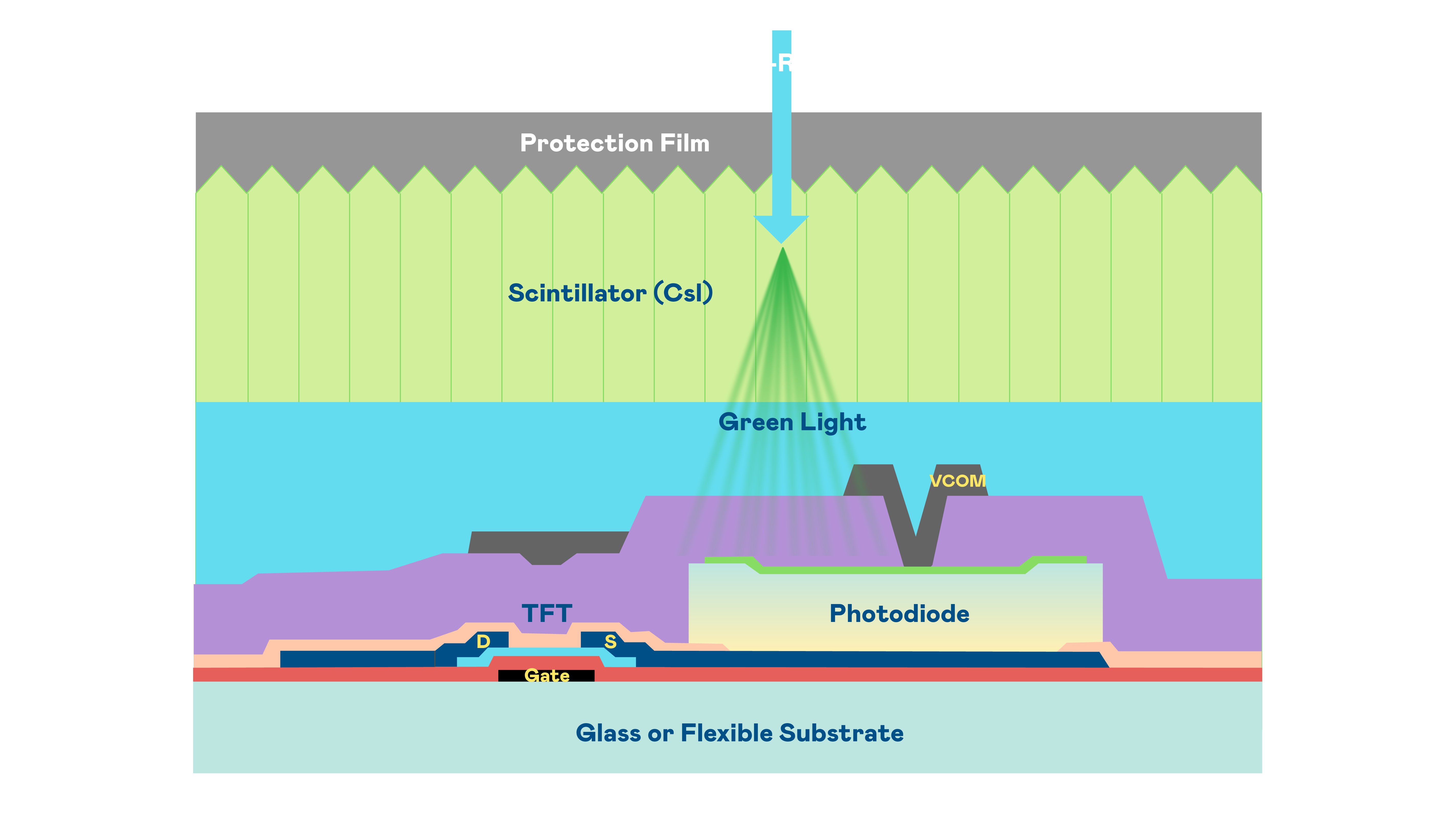 永利皇宫官网的X光影像感测阵列使用薄膜电晶体 (TFT) 作为每个像素的读取开关,搭配光电二极体(Photodiode)的光电转换元件,用以感测X光影像讯号。